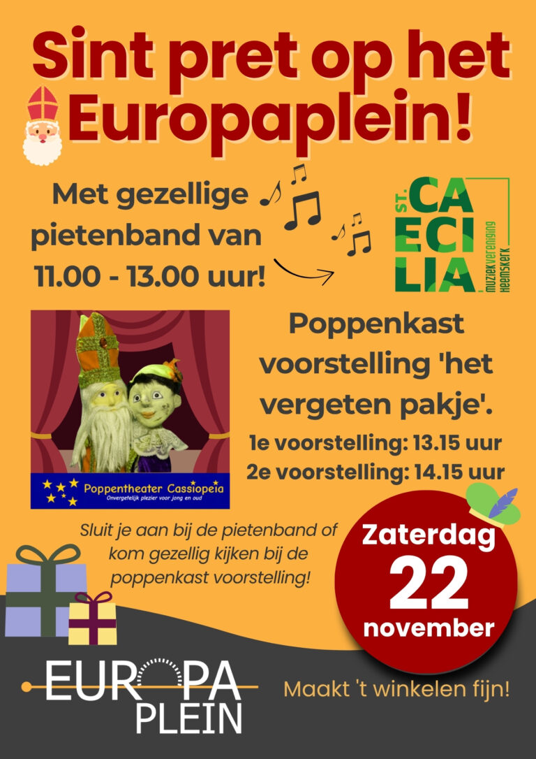 Kom op zaterdag 22 november naar het Europaplein! Sluit je aan bij de pietenband of kom gezellig kijken bij de poppenkast voorstelling.